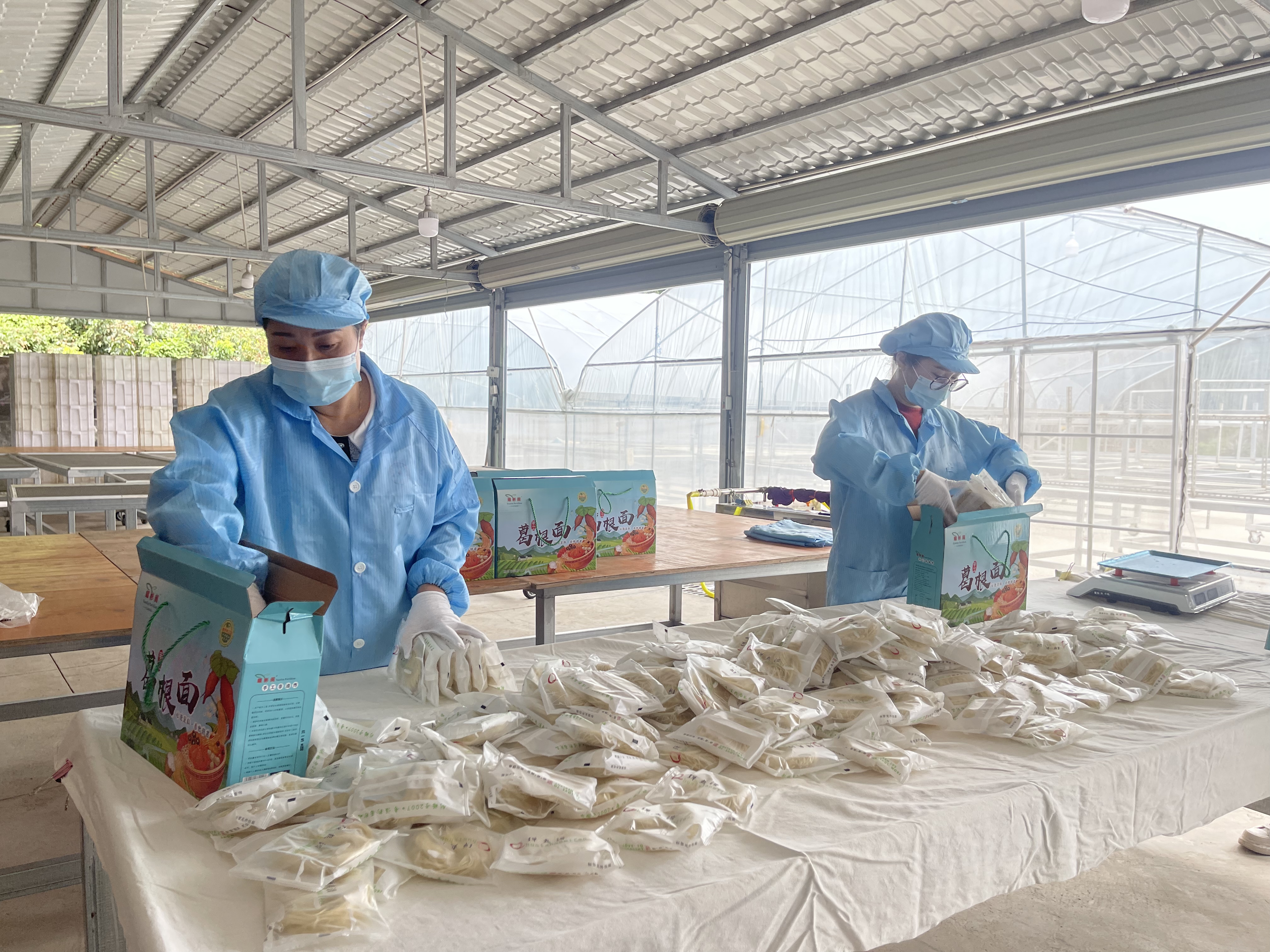 二產(chǎn)則是做強品牌。種植之余,一些新圩村村民建起了加工廠,生產(chǎn)制作葛粉、淮山絲、淮山餅等初加工產(chǎn)品,開發(fā)淮山奶茶、淮山粉、淮山片等精深加工產(chǎn)品,不僅延長了銷售周期,更是提升了農(nóng)產(chǎn)品附加值,農(nóng)特產(chǎn)品產(chǎn)業(yè)集群雛形漸顯。目前,“新圩三寶”禮盒銷售單價為100元/盒,銷售額約180萬元、毛利50余萬元。