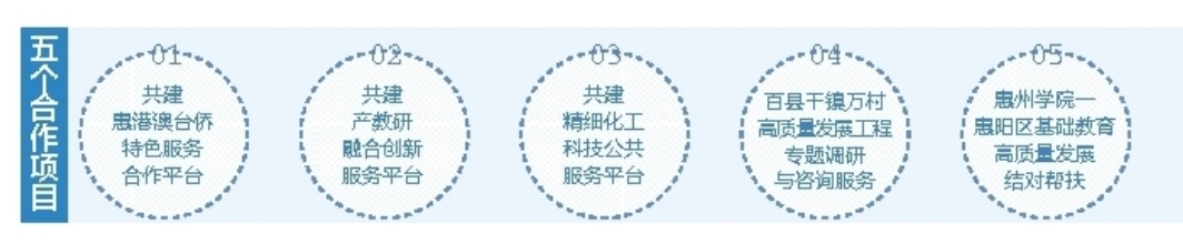 雙方先行在共建合作平臺(tái)、“百千萬工程”、基礎(chǔ)教育結(jié)對(duì)幫扶等三方面開展5個(gè)合作項(xiàng)目,包括共建惠港澳臺(tái)僑特色服務(wù)合作平臺(tái)、共建產(chǎn)教研融合創(chuàng)新服務(wù)平臺(tái)、共建精細(xì)化工科技公共服務(wù)平臺(tái)、“百縣千鎮(zhèn)萬村高質(zhì)量發(fā)展工程”專題調(diào)研與咨詢服務(wù)、惠州學(xué)院—惠陽區(qū)基礎(chǔ)教育高質(zhì)量發(fā)展結(jié)對(duì)幫扶。