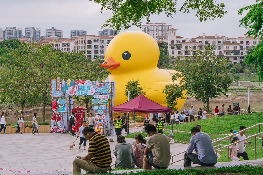 記者在淡水河兩岸看到,市民游客紛紛在大黃鴨前合影留念。家住惠城區(qū)的市民鄭女士同家人顯得十分興奮,原來她是專程自駕到惠陽打卡。“十年前我在香港維港打卡過大黃鴨,沒想到在惠州還有緣分再見到。”她覺得這次大黃鴨來到了自己的城市,像是老朋友來訪,讓她感到很溫馨。