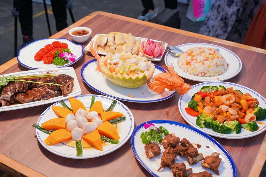 飯桌上七菜加炒飯,美味又創(chuàng)意。客家人招待當(dāng)屬“無雞不成宴”。貴妃荔枝雞是一道承載了鎮(zhèn)隆豐富文化內(nèi)涵的佳肴,精選荔枝果園走地雞,用荔枝湯慢煮浸熟,為雞肉增添了獨特的荔枝果香。荔枝海味奇緣清爽解膩,荔枝與蝦球、哈密瓜、百合、芹菜等食材跨界混搭,是傳統(tǒng)海鮮烹飪的創(chuàng)新與融合。荔枝蝦球是一道創(chuàng)意與美味兼具的精致菜品,鮮嫩大蝦搭配爽脆的馬蹄巧妙地制成蝦球,裹上脆花粒入鍋油炸,出鍋后是一顆顆形如荔枝的精致炸物,幾乎以假亂真。荔香客家祿鵝采用鎮(zhèn)隆獨有的祿鵝烹飪方式,將荔枝的清香滲入鵝肉當(dāng)中,使鵝肉充分吸收了荔枝的果香和清甜,同時自身的肉香也得以完美保留,并佐以秘制醬料,讓人口齒留香。荔枝咕嚕肉,將精選五花肉裹粉入鍋油炸成外層酥脆,佐以荔枝酸甜開胃,清爽不油膩,且散發(fā)著淡淡果香。還有醬香荔枝骨是一道結(jié)合了荔枝的果香與排骨肉香的新式菜品。