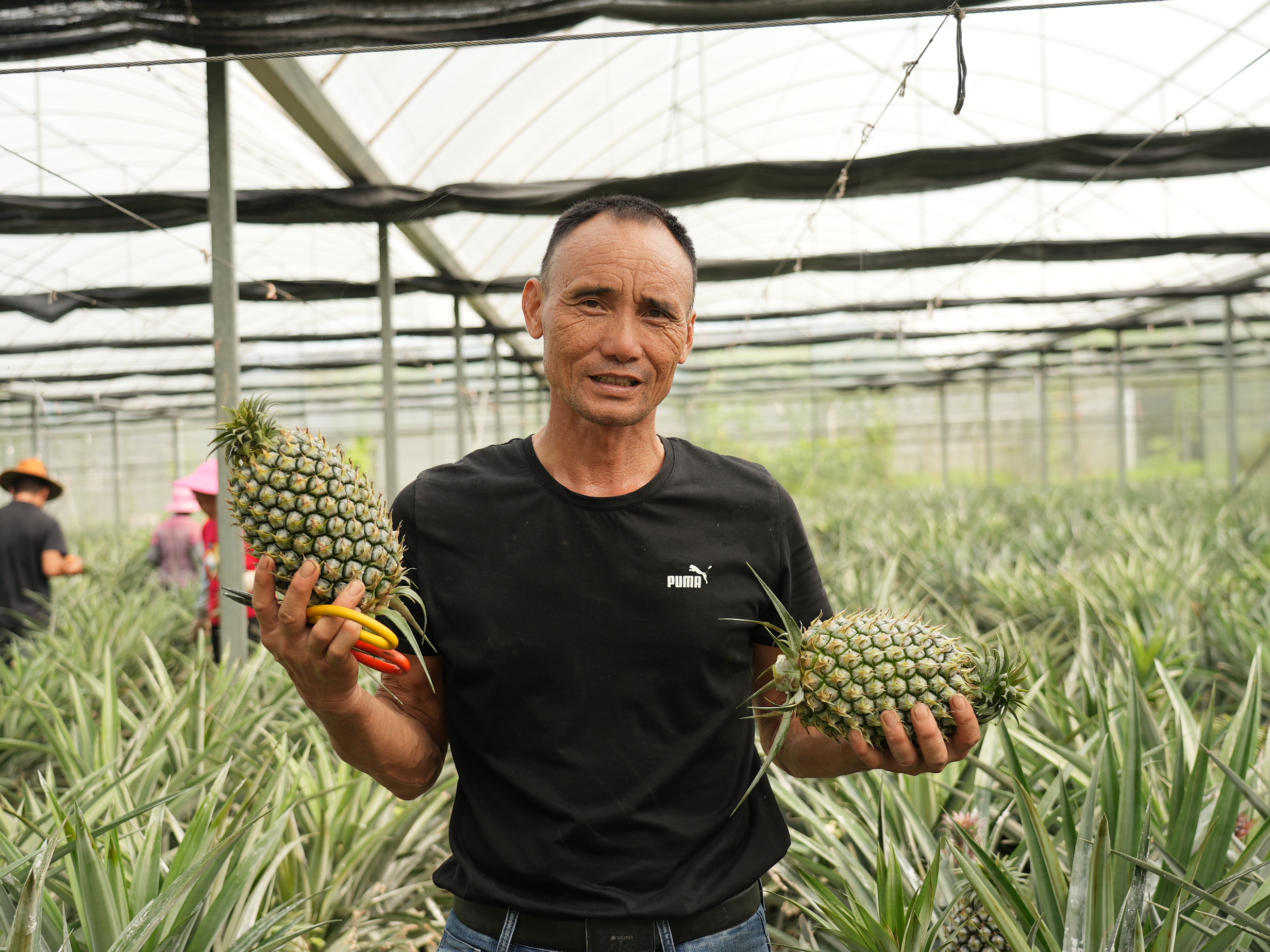 走進亞維濃生態(tài)園鳳梨種植大棚,眼前一片郁郁蔥蔥,一顆顆鳳梨從層層葉片中冒出頭來,個頭飽滿。工人們錯落分散在大棚里,忙著采收,一派豐收景象。