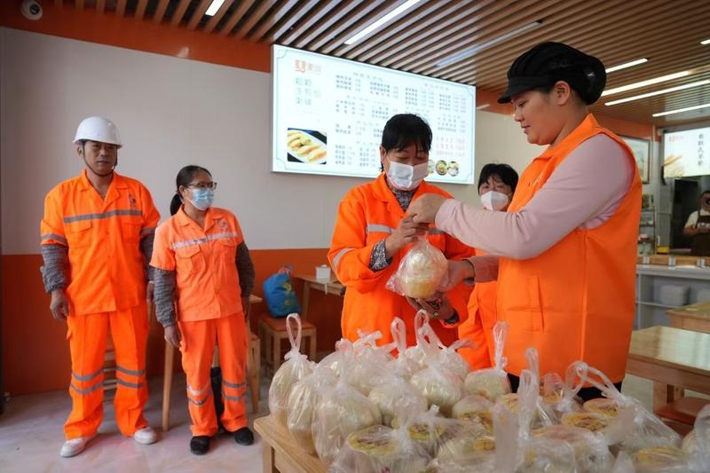 麥尚粗糧生煎包粥鋪為環(huán)衛(wèi)工人提供愛(ài)心早餐。