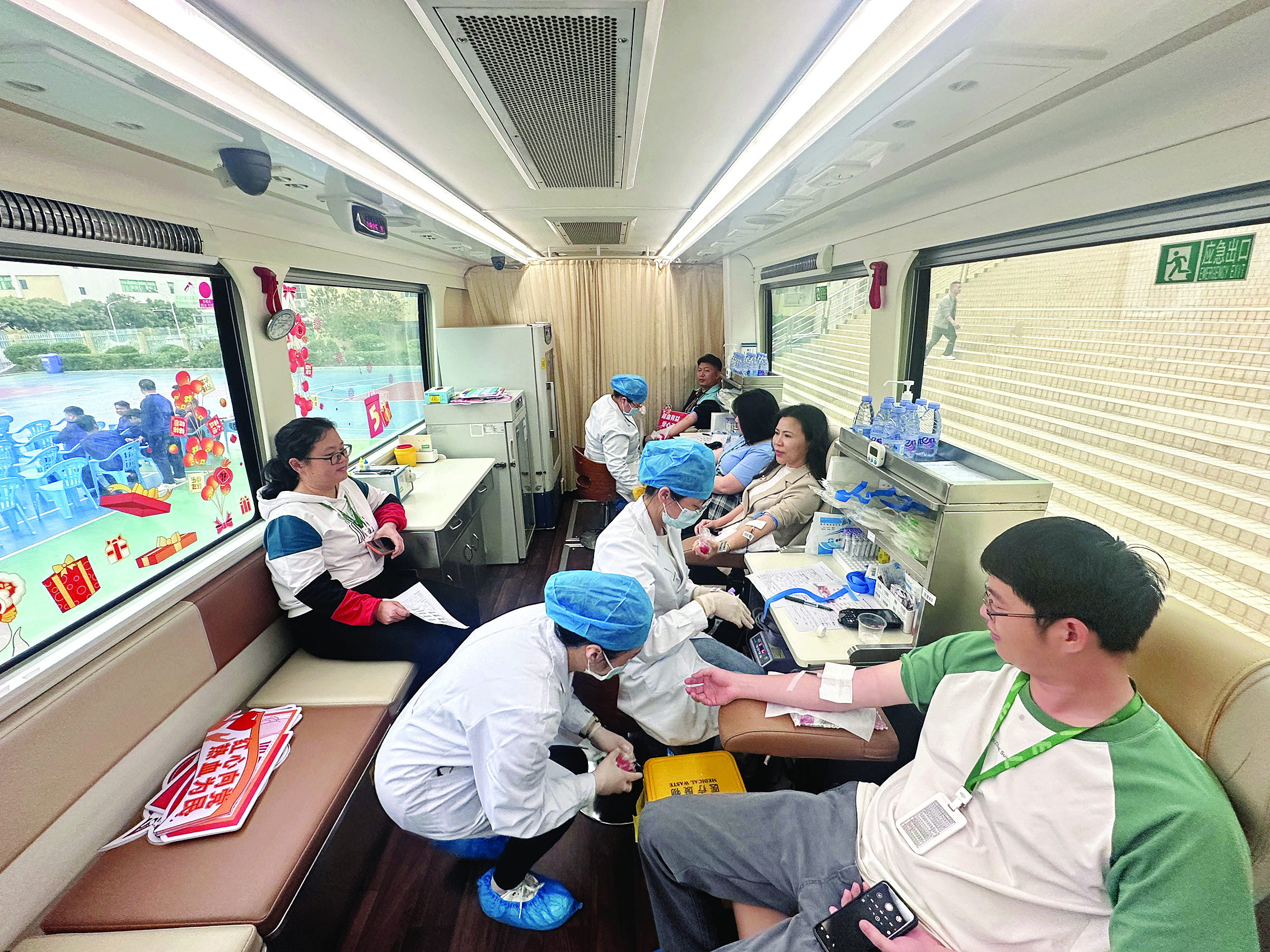 員工們登上采血車無(wú)償獻(xiàn)血。