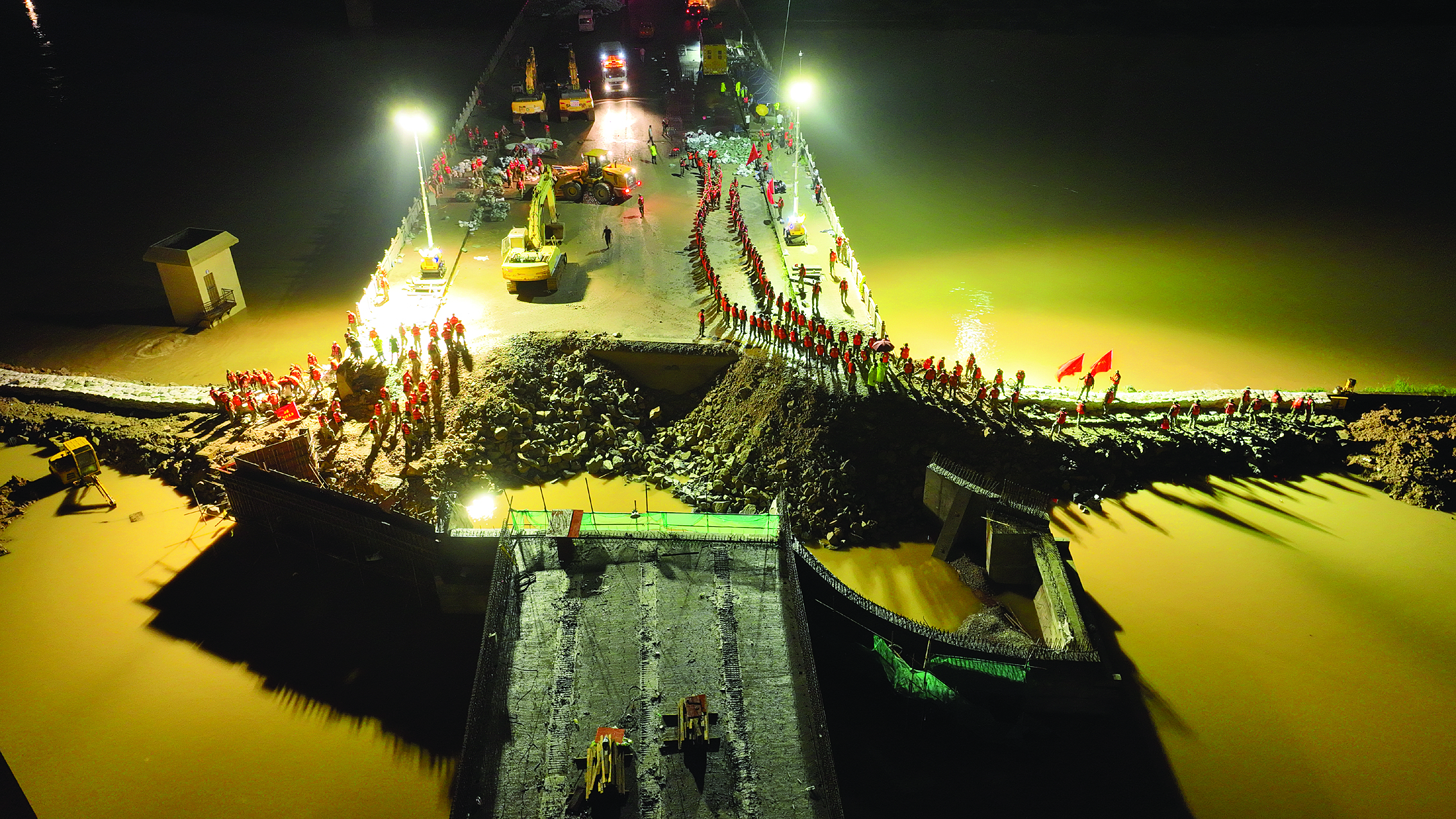 記者看到,鏟車轟鳴著在推土,卡車在雨霧中穿梭,挖掘機(jī)忙碌運(yùn)送砂石。經(jīng)過連續(xù)奮戰(zhàn),累計(jì)填筑土方石料約5800立方米、沙袋約1萬個(gè),當(dāng)晚19時(shí)50分,隨著最后一車土石料精準(zhǔn)填筑到位,漫堤順利完成合龍。