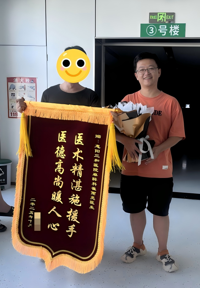 “崔醫(yī)生,那天要是沒有您,我真不知道該怎么辦!”10月2日上午,惠陽三和醫(yī)院手術(shù)室門外,一名年輕男子手捧一面鮮紅錦旗,懷中還抱著一束用筆精心制作的紙藝花束,在人群的目光中徑直走向手術(shù)室門口,只為尋找那位讓他銘記于心的崔雨亮醫(yī)生。