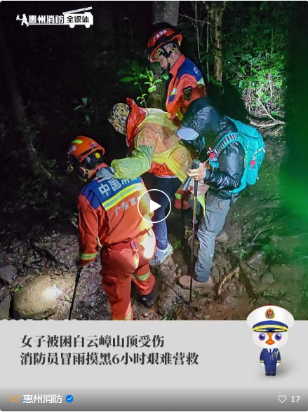 2025年10月22日下午,惠陽區(qū)新圩鎮(zhèn)白云嶂山頂發(fā)生一起緊急救援事件。一名女性登山愛好者因腳踝扭傷被困山頂,無法自行下山。新圩鎮(zhèn)專職消防隊接警后迅速響應(yīng),歷經(jīng)近6小時徒步救援,最終成功將被困女子轉(zhuǎn)移至安全地帶。