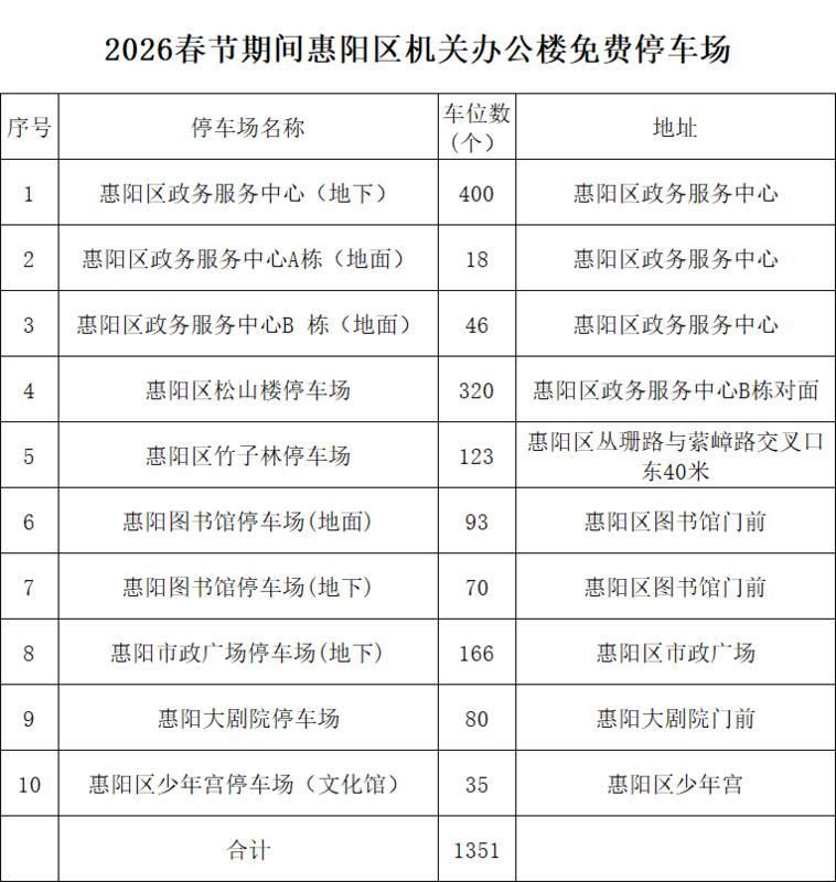 惠州日報訊 (記者李芳娟)春節(jié)將至,惠陽送上暖心便民舉措。為方便市民節(jié)日出行停車,惠陽區(qū)委、區(qū)政府聚焦群眾實際需求,以務(wù)實行動提升公共服務(wù)體驗,將在2026年春節(jié)假期免費開放10處機(jī)關(guān)辦公樓停車場,為社會公眾提供1351個公共停車位。此次停車場免費開放時段:2026年2月15日零時~2月23日24時,全力保障節(jié)日停車需求。