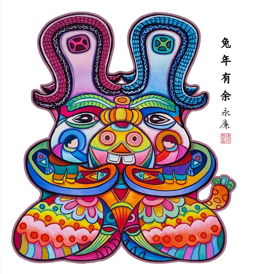 卯兔位列十二生肖之四,“卯”代表春意,代表黎明,充滿無限生機(jī),“兔”的諧音則有揚(yáng)眉吐(兔)氣、前途(兔)似錦、大展宏圖(兔)等,蘊(yùn)含美好寓意。85后畫家鐘永廉創(chuàng)作的《瑞兔呈祥賀新年》系列作品,包括《兔氣揚(yáng)眉》《兔年有余》《兔露心聲》《瑤兔獻(xiàn)瑞》《I love you 兔》等,傳統(tǒng)與現(xiàn)代結(jié)合,色彩鮮艷,造型生動,展現(xiàn)對生活美好的祝愿。