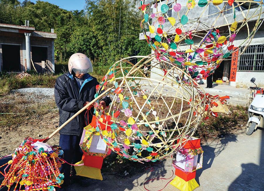 何廖福還告訴記者,他七歲開(kāi)始跟爺爺學(xué)做花燈,虎頭花燈以竹、紙為主要材料,它的制作過(guò)程主要包括扎架、剪紙、卷燈帶、裱糊、做燈斗與鳳雞等。