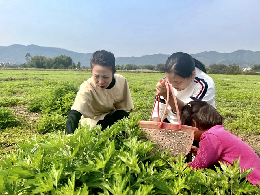 鐘曉燕(左一)與村民采摘成熟的艾草。 惠州日報記者黃宇翔 通訊員龍融心 攝