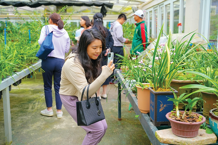 蘭花愛好者在南昆山翠蘭谷生態(tài)度假村“蘭園”內賞蘭拍照留念。