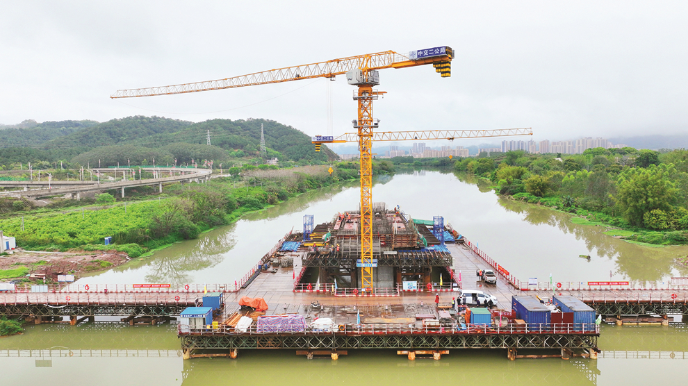 龍門大橋新建工程項目施工現(xiàn)場塔吊林立、機器轟鳴。 惠州日報記者湯渝杭 攝