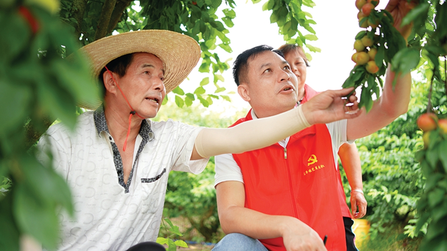 村干部與農(nóng)戶一同在田間地頭查看果蔬生長情況。