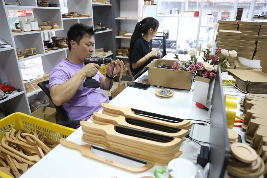 工作人員正仔細拼裝竹木制品。 惠州日報記者黃宇翔 特約通訊員黃偉光 攝