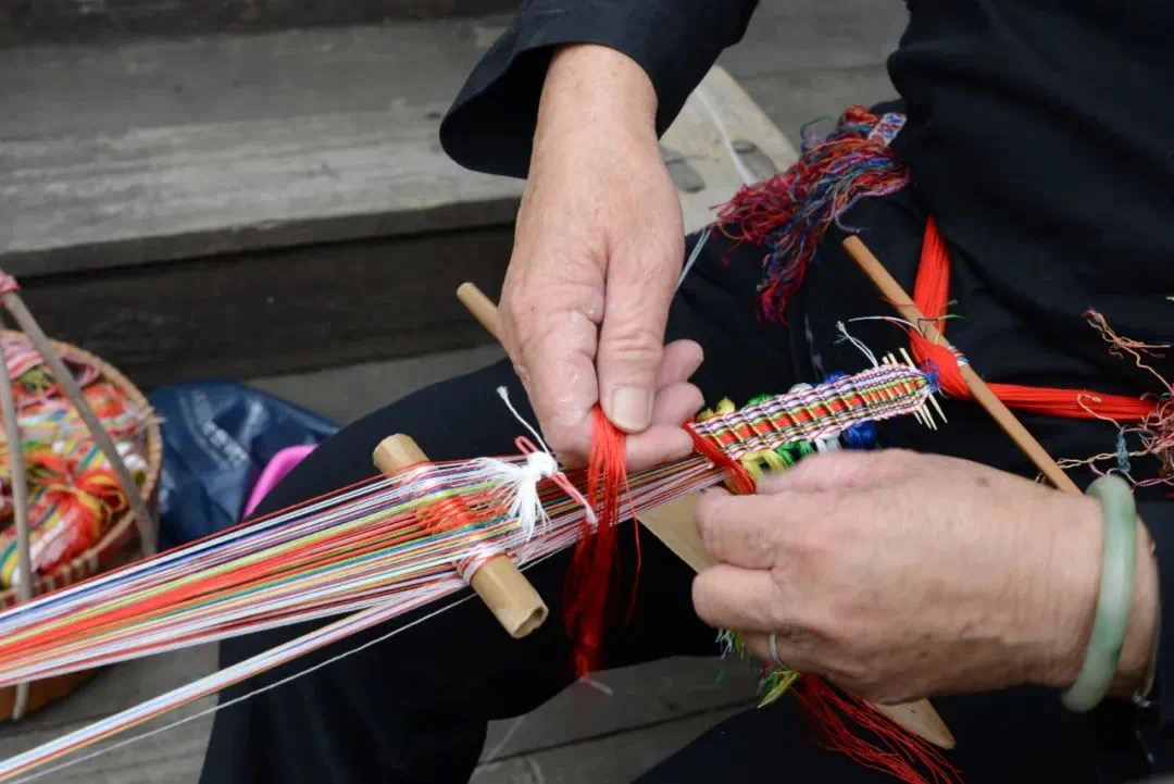 織帶仔考驗(yàn)的是耐心,需要用六七十條乃至上百條絲線進(jìn)行編織,另外,織帶仔也講究季節(jié),夏天炎熱,手指容易出汗,會(huì)影響帶仔的質(zhì)量。因此,一般要到秋涼才開始織帶仔。織好的帶仔上,有豬肚、雞嘴、筷子、欖仔欖殼、松仁松籽等圖案。在藍(lán)田瑤族鄉(xiāng)的方言中,松籽和“重喜”相近,欖仔和“攬子”相近,而雞嘴、豬肚則是農(nóng)耕生活的象征。