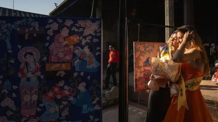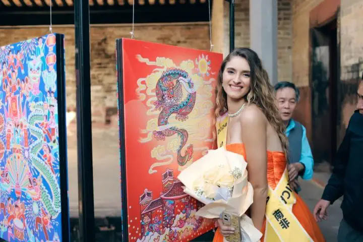 龍門農(nóng)民畫那濃烈鮮艷的色彩、質(zhì)樸生動(dòng)的風(fēng)格深深吸引著世界旅游小姐,她們紛紛與農(nóng)民畫作品合影留念,舉手投足間盡顯迷人風(fēng)姿,構(gòu)成了一道文化與美人相互輝映的靚麗風(fēng)景線。