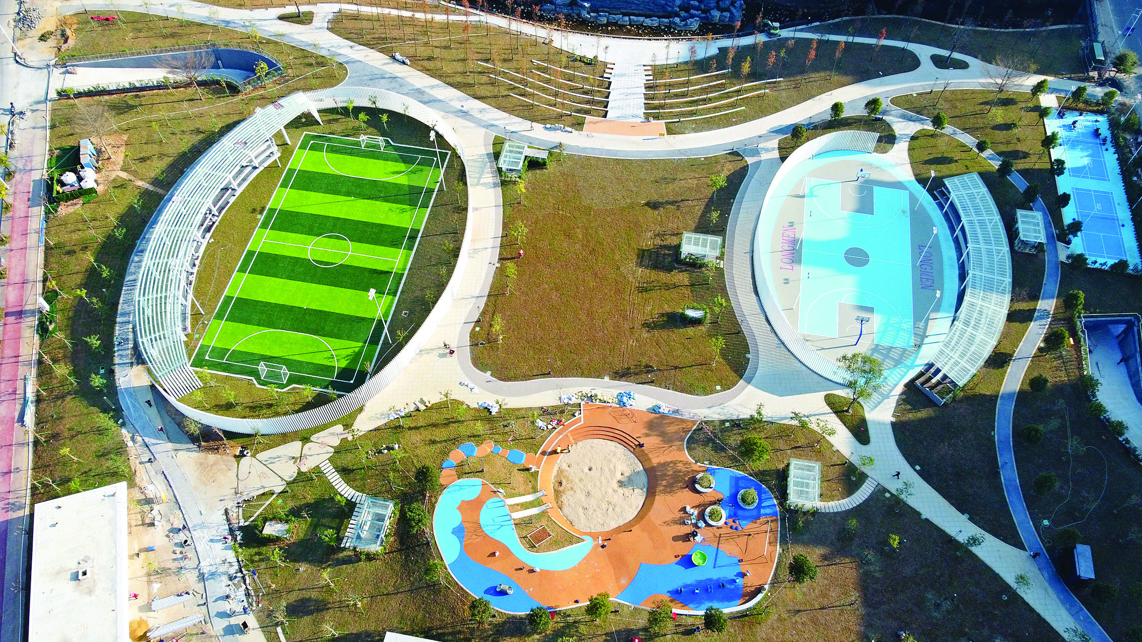 據(jù)介紹,游龍公園以打造“全年齡段市民的縣級(jí)綜合公園”為定位,按照“游龍之文韻,祈龍門之康樂”的設(shè)計(jì)理念開展建設(shè)。公園占地面積約4萬(wàn)平方米,涵蓋文化體驗(yàn)區(qū)、疏林活動(dòng)區(qū)、運(yùn)動(dòng)健身區(qū)、濱水休閑區(qū)四大片區(qū),園內(nèi)設(shè)有戶外小廣場(chǎng)、公共運(yùn)動(dòng)場(chǎng)、休閑綠地、人行路徑以及兒童友好公園設(shè)施等多層次的景觀空間。同時(shí),公園還建設(shè)了面積約13300平方米的半地下停車庫(kù),共設(shè)有470個(gè)車位。