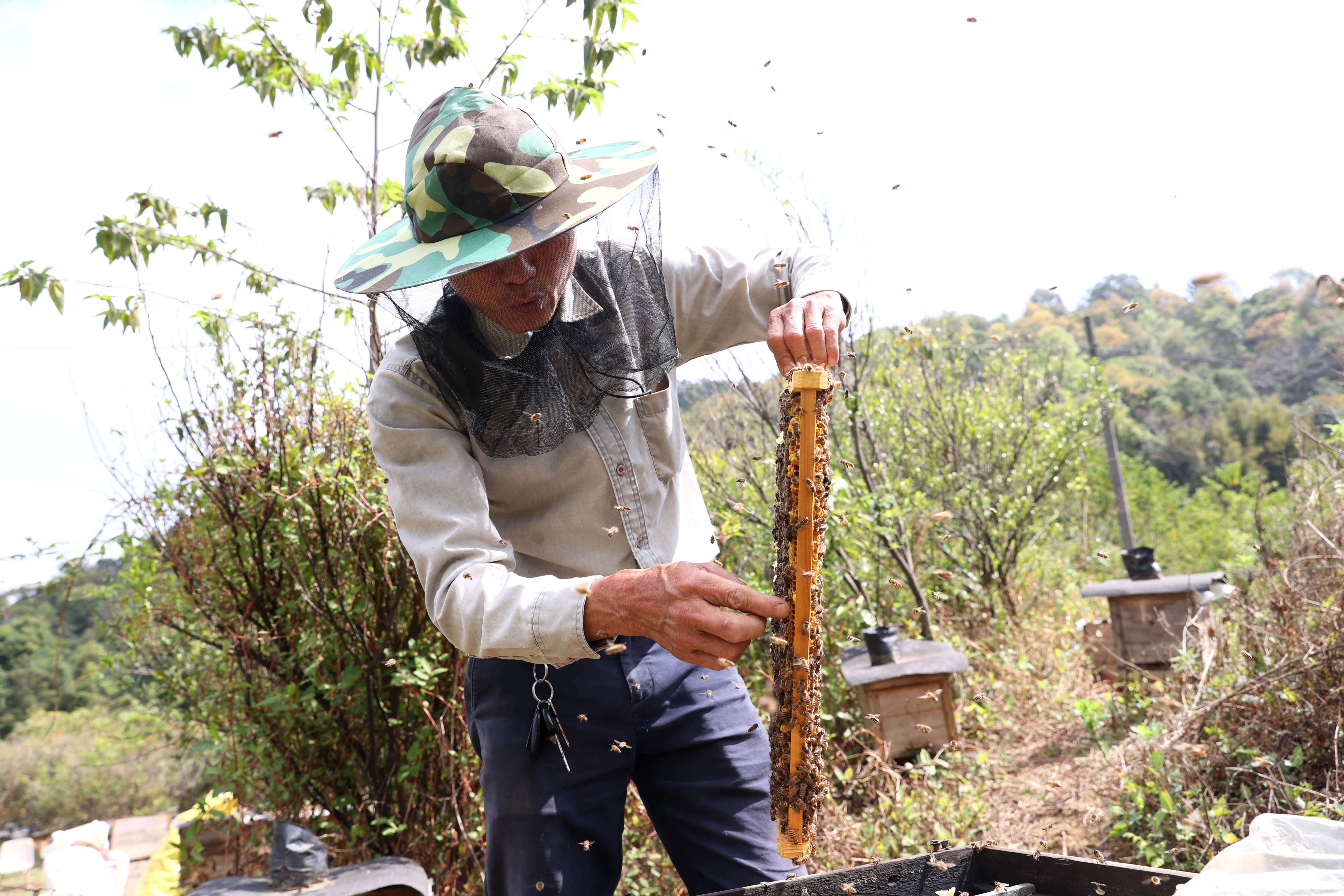 蜂農(nóng)鄭海強在查看蜂蜜情況。