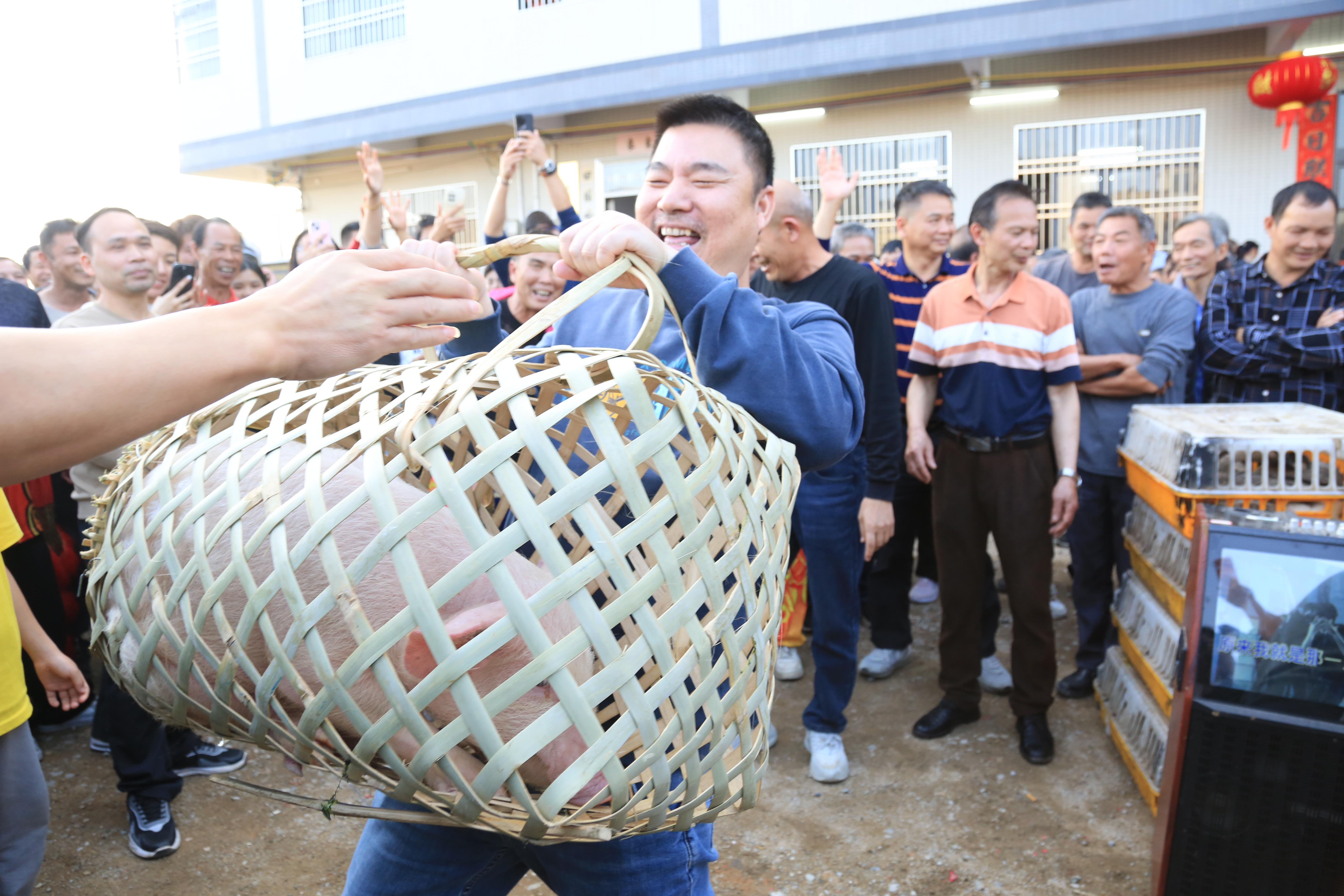 搶到炮頭的村民開心兌換一只小豬。 惠州日報記者黃宇翔 特約通訊員黃偉光 攝
