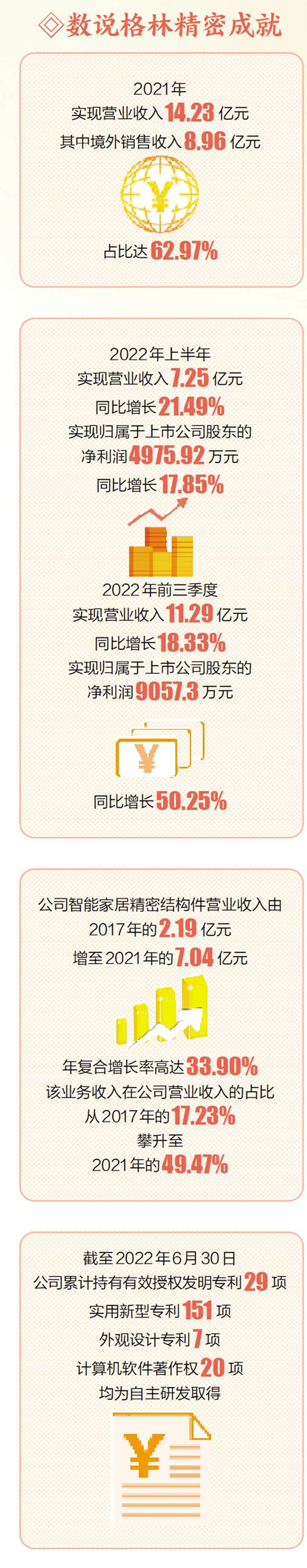 “技術(shù)優(yōu)勢是格林精密的核心競爭力。二十年來,格林精密始終保持著強勁發(fā)展活力,不斷有產(chǎn)品推陳出新,靠的正是長期以來堅持不懈的技術(shù)創(chuàng)新。”吳寶玉說,格林精密在模具設(shè)計制造、沖壓成型、注塑成型、CNC成型、表面處理、自動化制造及天線等方面擁有多項行業(yè)領(lǐng)先的核心技術(shù)。截至2022年6月30日,公司累計持有有效授權(quán)發(fā)明專利29項、實用新型專利151項、外觀設(shè)計專利7項、計算機軟件著作權(quán)20項,均為自主研發(fā)取得,使得公司在市場競爭中處于優(yōu)勢地位。