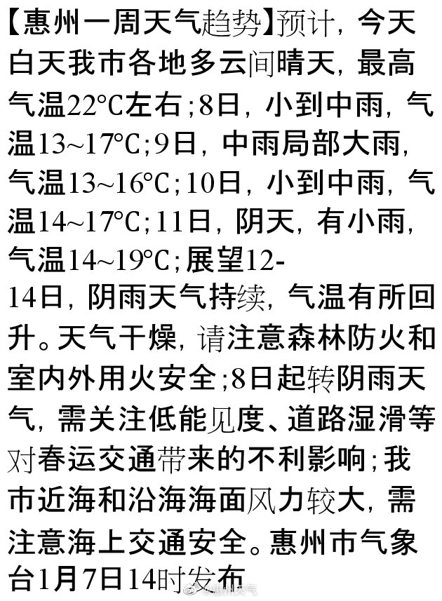 春運(yùn)期間天氣階段性變化顯著,氣溫波動(dòng)較大,主要有5次冷空氣過程,大致出現(xiàn)在1月8~10日(弱)、1月15~17日(中等偏強(qiáng))、1月20~24日(中等偏強(qiáng))、1月29~31日(中等)、2月7~9日(弱),但出現(xiàn)類似2008年大范圍持續(xù)性低溫雨雪冰凍災(zāi)害和2016年冬季暴雨的可能性較小。惠州市氣象臺(tái)提醒,需關(guān)注階段性低溫陰雨天氣及低能見度、道路濕滑等對春運(yùn)交通帶來的不利影響。