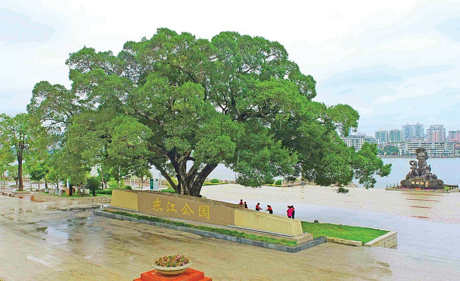 東江公園,古樹亭亭如華蓋,東江悠悠向西流。