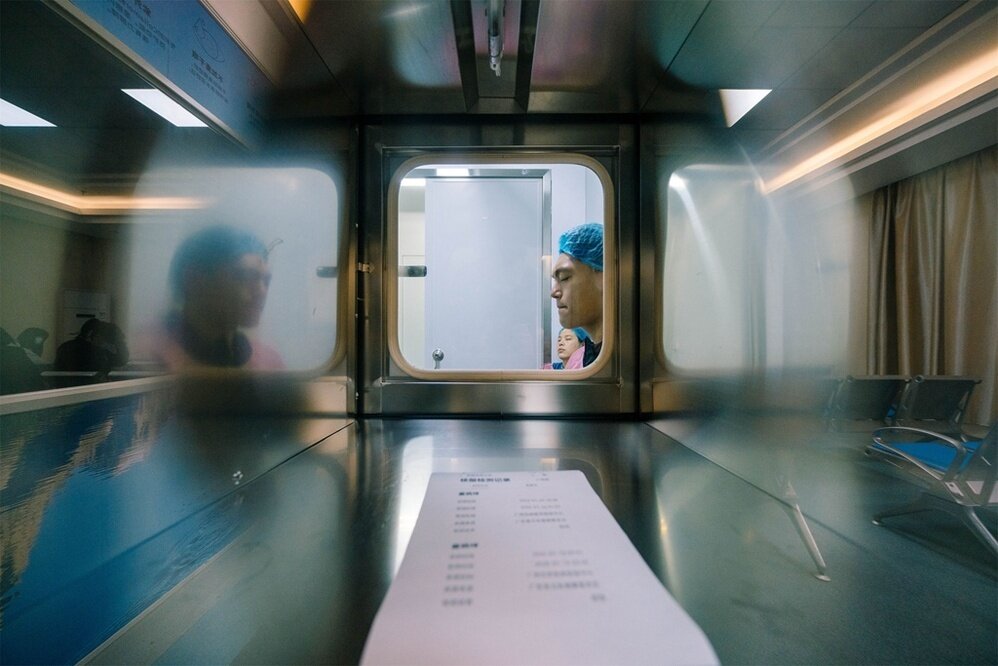 2022年1月26日,惠州一眼科醫(yī)院手術(shù)室前,等待擺脫眼鏡的近視患者。