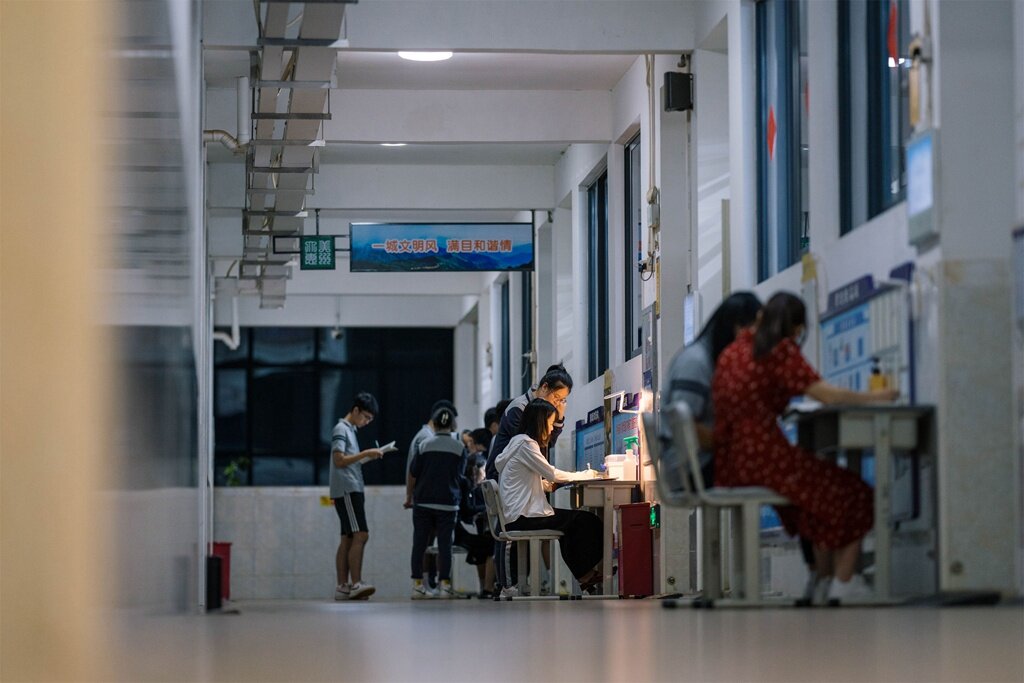 2022年4月14日,惠州中學晚自習的樓道上,師生們在燈下奮戰(zhàn)。