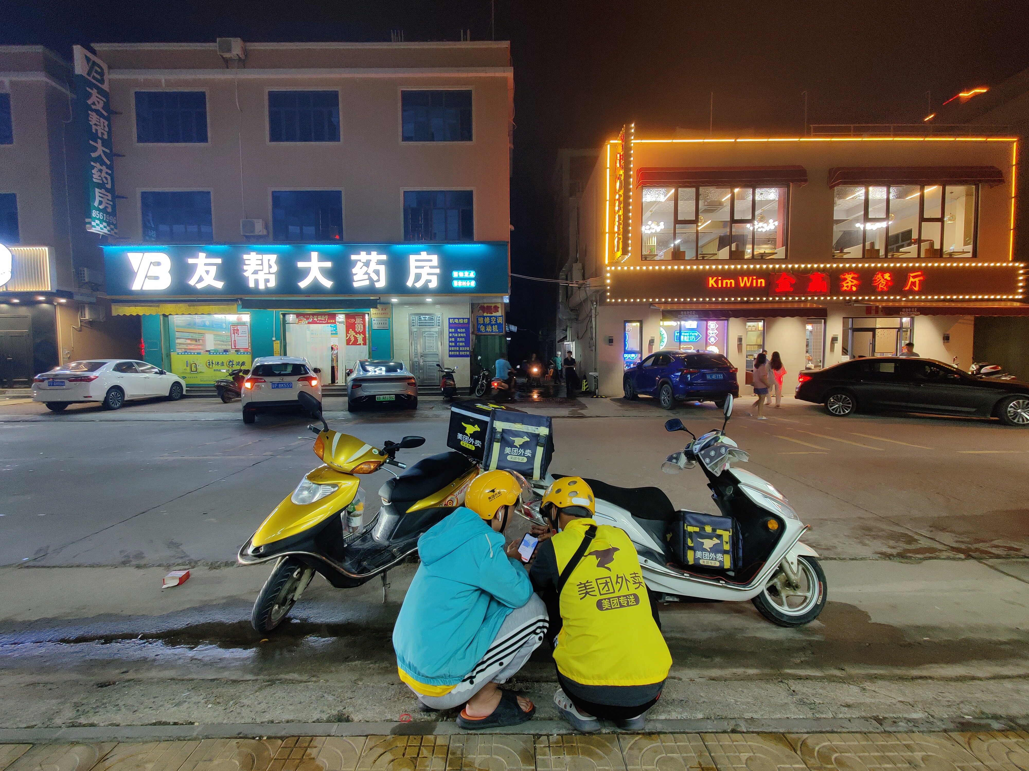2022年5月28日,惠東港口鎮(zhèn)的外賣小哥,利用工作間隙在路邊休息交流