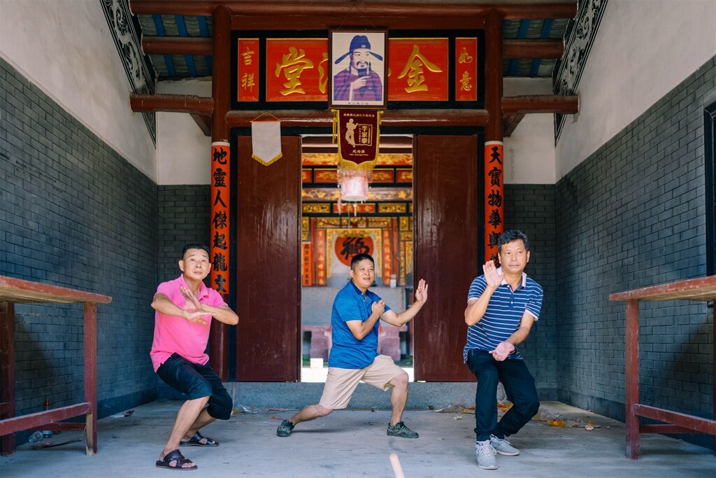 2022年7月8日,惠州三棟鎮(zhèn)李家拳的傳承人,在祠堂交流拳法。