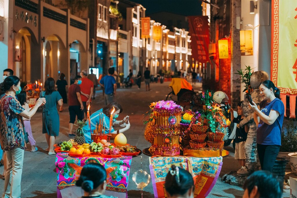 2022年9月10日,時值中秋佳節(jié),在惠州水東街街頭隨處可見人們擺出月餅、柿子、紅柚、月光餅等祭品,祭拜月亮。