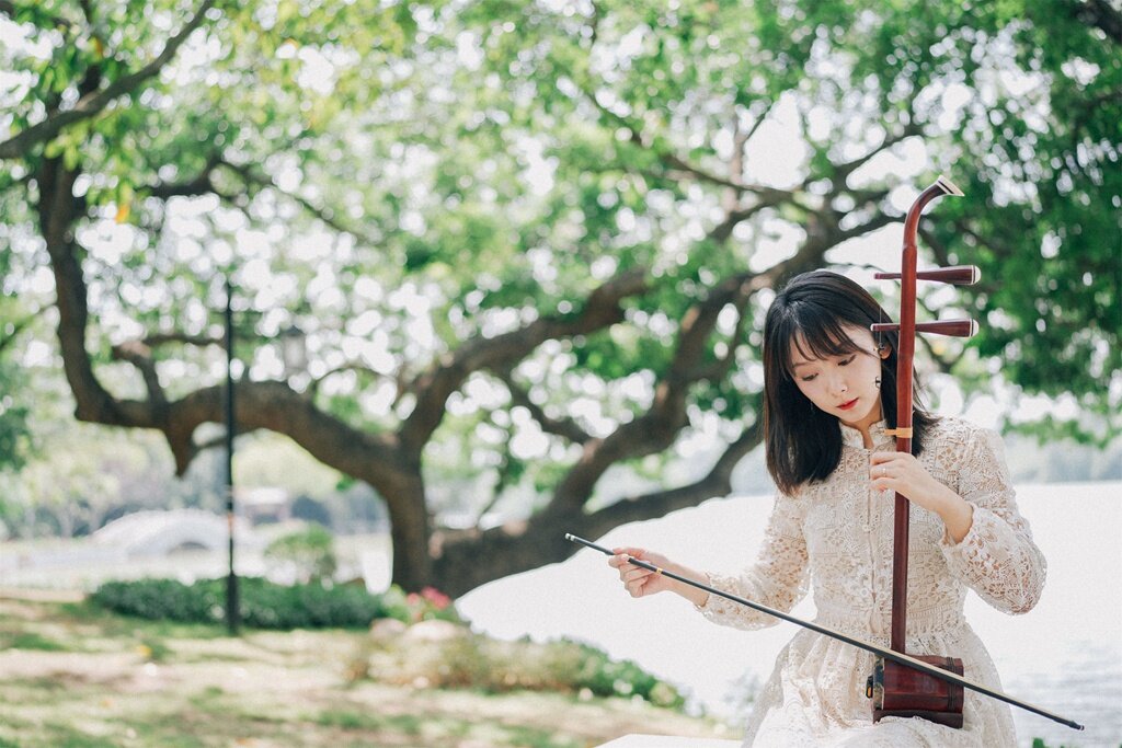 2022年10月5日, 一名女孩在西湖邊練習二胡。