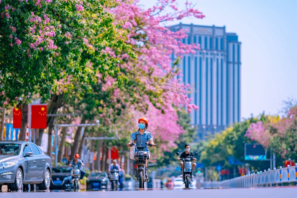 2022年10月8日,惠城區(qū)下角道旁樹花朵盛開,讓過路人不時側(cè)目觀賞。