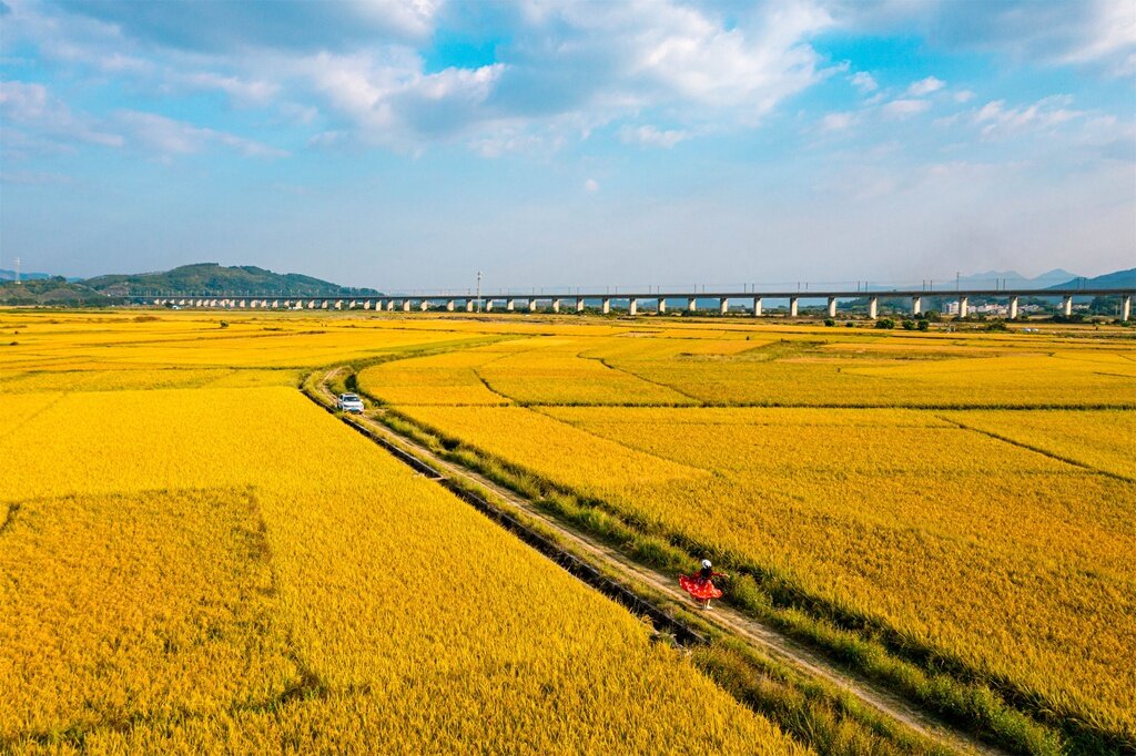 2022年10月29日,惠東縣稔山鎮(zhèn)稻田迎來豐收,整片金黃。