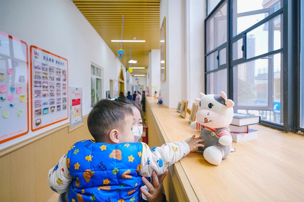 2022年12月13日,一家早教機構(gòu),幼兒在教師的帶領(lǐng)下與玩偶互動。
