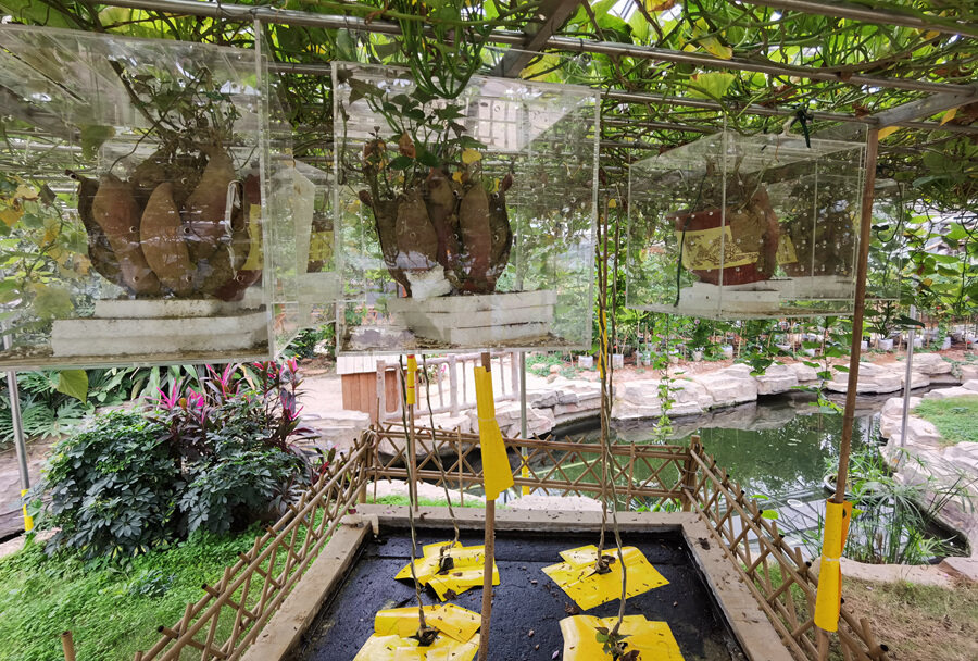 地瓜苗從地底下長出,地上打好架子,番薯藤苗鋪滿整個(gè)架子,猶如一把方形的大傘蓋在上面。架子下面有若干個(gè)透明的箱子,每個(gè)箱子里都掛著一串碩大的番薯。每串番薯,不僅數(shù)量不少,而且個(gè)頭還大。除了番薯,薯苗藤上還開出了不少紫花。這一農(nóng)業(yè)奇觀,打破了傳統(tǒng)薯塊地下長的常規(guī)特性,實(shí)現(xiàn)空中掛薯,把攀地生長的番薯培育成猶如葡萄架式栽培的番薯樹,給人帶來創(chuàng)新的啟發(fā)與思維的沖擊。