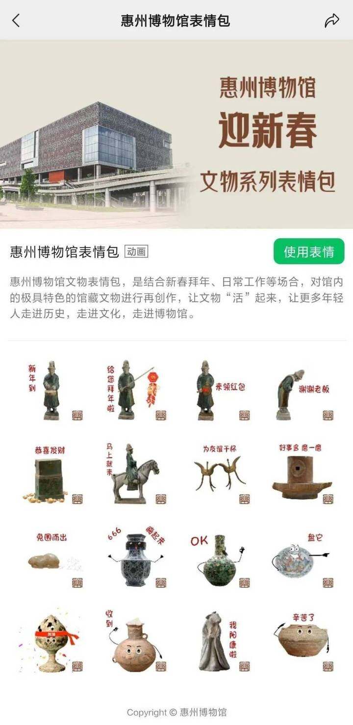 近日,惠州市博物館制作發(fā)布了首套“迎新春”文物表情包。在館藏文物精品的基礎(chǔ)上,融入現(xiàn)代大眾的生活元素,這一系列表情包可以讓年輕朋友走進(jìn)市博物館,了解惠州的歷史文化。通過(guò)微信表情商店搜索“惠州博物館”,或掃描二維碼就可以免費(fèi)下載。