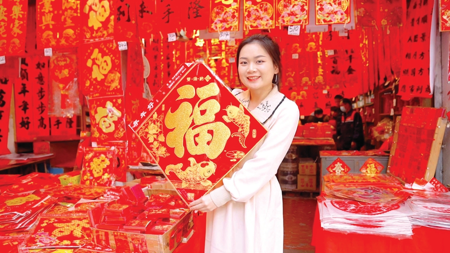 行走在人聲鼎沸的集市里,商品多得讓人有點應接不暇。既有藤編筐簍、鍛打農(nóng)具等傳統(tǒng)手工藝品,也有雞鴨魚肉、時蔬水果等農(nóng)家產(chǎn)品。隨著春節(jié)腳步臨近,掛滿燈籠、春聯(lián)等應節(jié)物品的攤檔前,前來選購的村民更是絡繹不絕。