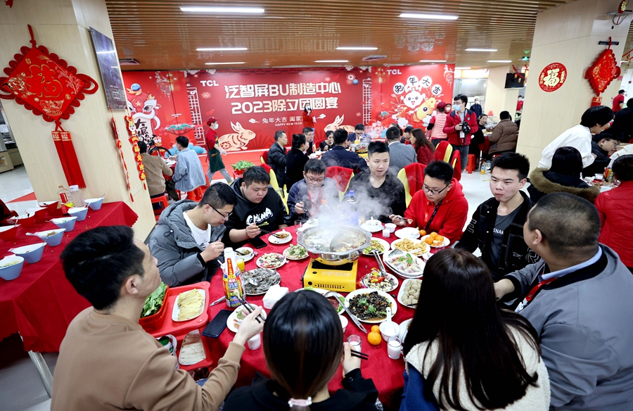 惠州TCL液晶產(chǎn)業(yè)園有5000多位員工,請(qǐng)留守員工代表吃年夜飯是園區(qū)2009年建成以來的“保留節(jié)目”。隨著疫情防控政策調(diào)整,消費(fèi)活力正快速?gòu)?fù)蘇,TCL王牌電器(惠州)有限公司今年一季度訂單量增大,園區(qū)今年有1500多位員工留守,春節(jié)期間1000多位員工將加班生產(chǎn)。