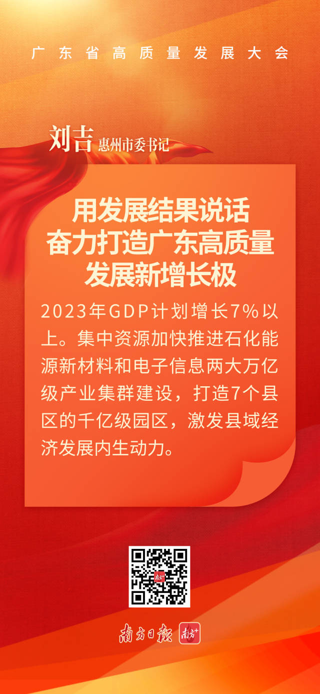 惠州市委書記劉吉表示,省委省政府開年第一天召開這次高質(zhì)量發(fā)展大會,發(fā)出了大抓實體經(jīng)濟、加快高質(zhì)量發(fā)展的動員令。惠州將奮發(fā)進取、奮勇爭先,堅決落實好省委制造業(yè)當家戰(zhàn)略,努力交出一份合格的惠州答卷。我們將保持近幾年向上向好的態(tài)勢,2023年GDP計劃增長7%以上。我們將集中資源加快推進石化能源新材料和電子信息兩大萬億級產(chǎn)業(yè)集群建設(shè),不斷增強產(chǎn)業(yè)核心競爭力。我們將做強做優(yōu)3個國家級園區(qū)同時打造7個縣區(qū)的千億級園區(qū),激發(fā)縣域經(jīng)濟發(fā)展內(nèi)生動力。我們清醒認識到高質(zhì)量發(fā)展就是要實干興邦,惠州將腳踏實地、扎扎實實做好自己的事,用發(fā)展結(jié)果說話,奮力打造廣東高質(zhì)量發(fā)展新增長極。
