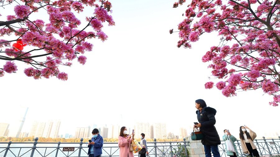1月31日,在冬日暖陽(yáng)下,陸陸續(xù)續(xù)有市民來(lái)打卡,邂逅浪漫的紫花風(fēng)鈴。走近紫花風(fēng)鈴木,只見滿樹枝頭都是一簇簇紫紅色的花朵,整株樹幾乎沒有葉片,猶如編織了一個(gè)紫色的風(fēng)鈴。漫步其中,讓人在冬天里享受春天的感覺。