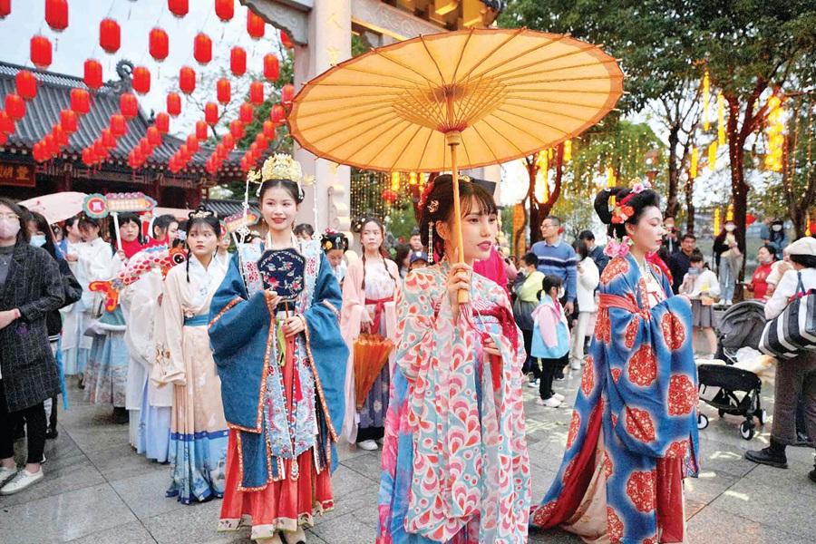 年近60的陶大姐是一名漢服愛好者,只見她身著漢服,興致勃勃地舉著自拍桿用手機直播現(xiàn)場活動。“今天人山人海,一片繁榮昌盛,今天的元宵節(jié)活動,能讓大家看到很多傳統(tǒng)文化和藝術(shù),非常精彩。”陶大姐說,自己愛好攝影,剛開始是看別人穿漢服,后來自己也穿上了,還帶領(lǐng)姐妹們一起穿,通過網(wǎng)絡(luò)一發(fā)布,又吸引了不少人加入隊伍。她希望通過當(dāng)天的直播,讓更多人領(lǐng)略傳統(tǒng)文化的魅力,共同弘揚傳統(tǒng)文化。