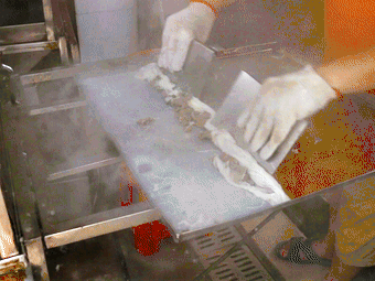 最后經(jīng)過蒸煮出爐的腸粉,輕薄透亮、厚度如紙、乳白色的表皮帶著適度的韌性,讓人無可挑剔。