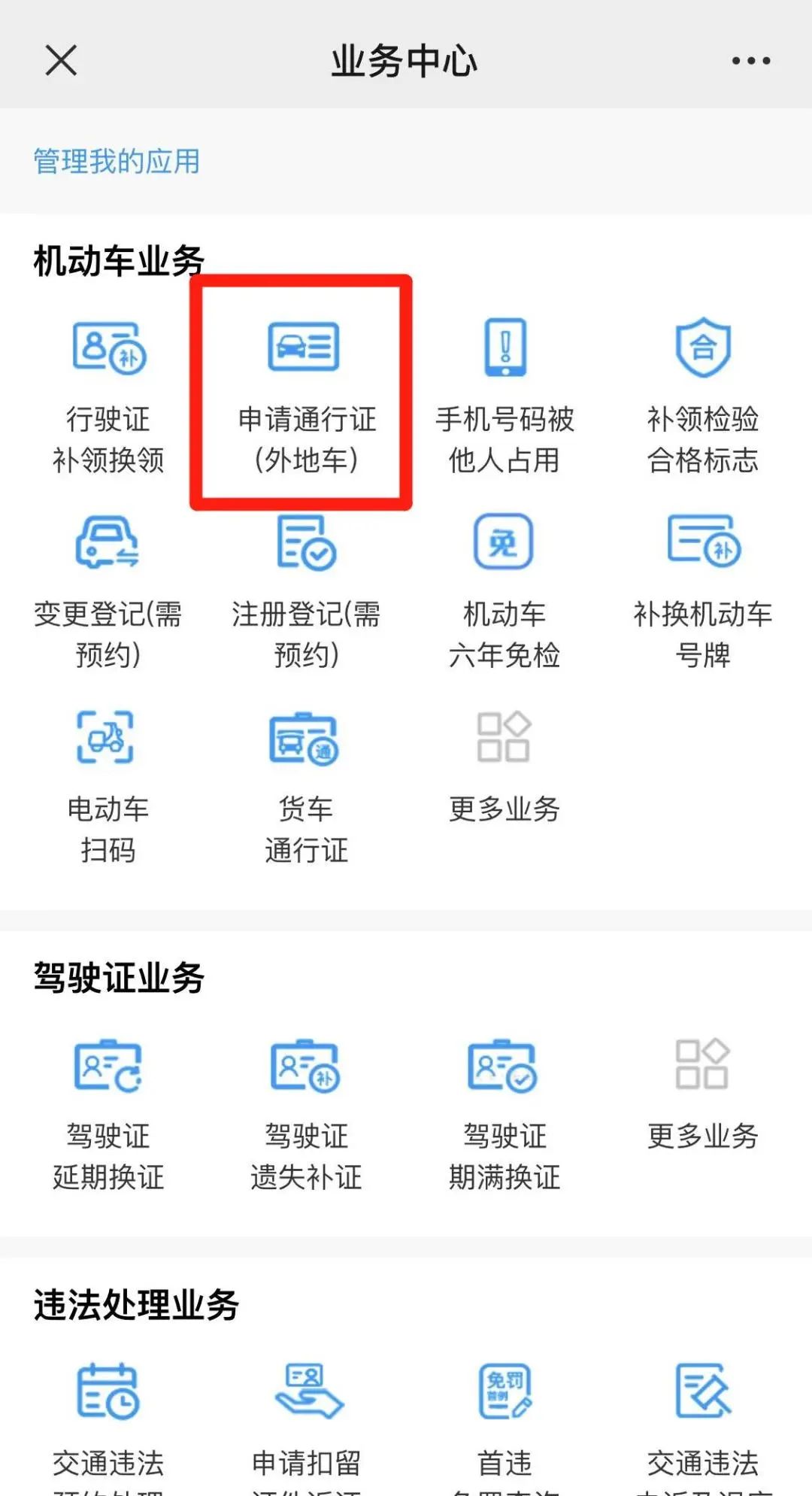 4、選擇機(jī)動(dòng)車業(yè)務(wù)中的“申請通行證(外地車)”;