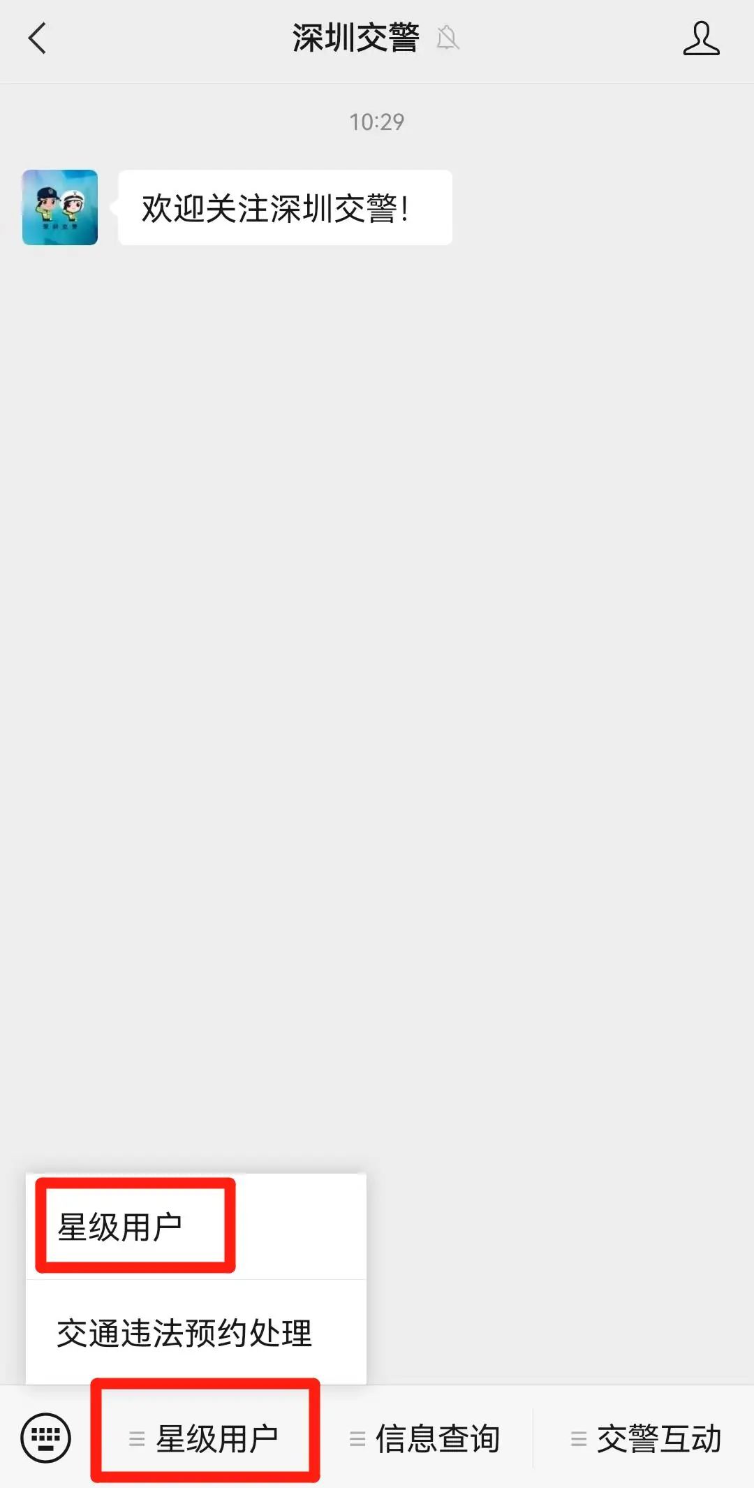 1、微信搜索“深圳交警”公眾號(hào),點(diǎn)擊菜單欄“星級用戶”;