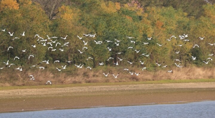 成群的長(zhǎng)腳反嘴鷸飛過水面蔚為壯觀。