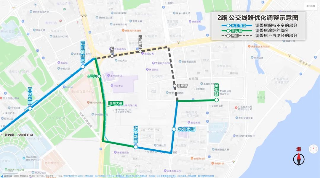 調(diào)整后途經(jīng)路段:調(diào)整2路取消云山東路、菊花一路部分路段,調(diào)整線路改由云山城軌站經(jīng)惠州大道、期湖塘路、菊花一路、金華路行駛。