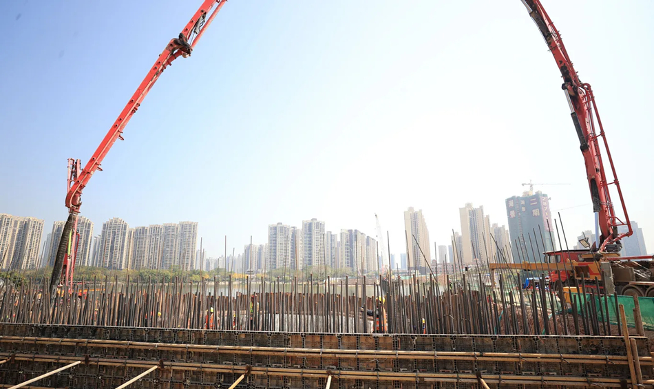 2月28日晚開(kāi)始承臺(tái)澆筑的是金山湖一號(hào)橋。記者3月1日上午在現(xiàn)場(chǎng)看到,混凝土天泵車伸出長(zhǎng)臂,將一車車混凝土澆筑到承臺(tái)內(nèi)。“我們正在進(jìn)行0號(hào)承臺(tái)的混凝土澆筑施工,橋梁共設(shè)置2個(gè)承臺(tái),承臺(tái)長(zhǎng)44.61米、寬36米、高4.5米,單個(gè)承臺(tái)混凝土方量為7300立方米。”金山湖一號(hào)橋項(xiàng)目副經(jīng)理鄧子敬介紹,金山湖一號(hào)橋橋梁全長(zhǎng)283米,為保證一次性跨越金山湖水道,橋梁設(shè)計(jì)凈跨達(dá)到196米,在相同結(jié)構(gòu)橋梁中,其跨度在全國(guó)位居前列。