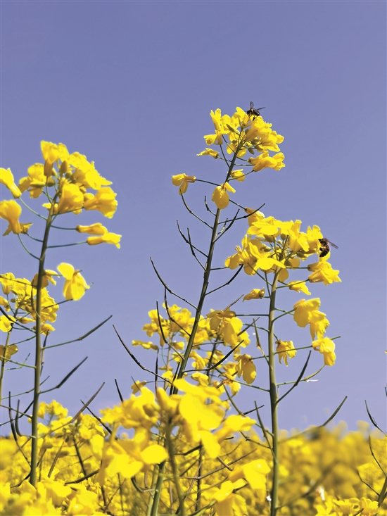 一片片金黃色的油菜花開滿了田間地頭,黃色的花朵點綴在綠葉間,微風拂過,搖曳生姿。金燦燦的油菜花還引來了無數(shù)小蜜蜂在花叢中“嗡嗡嗡”伴奏,好一派迷人的景象,令人賞心悅目,心曠神怡。趁著周末,不少的游客紛紛走出家門,在花叢中用鏡頭定格美好春光。