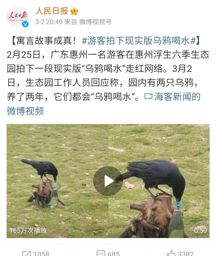 近日,一段拍攝于惠州羅浮山下浮生六季生態(tài)園的烏鴉喝水抖音視頻走紅網(wǎng)絡(luò)。視頻中,烏鴉不斷叼起草地上的石子,扔進(jìn)玻璃水瓶中,待水升起后,烏鴉喝到了水。網(wǎng)友驚呼,“原來(lái)小學(xué)課文《烏鴉喝水》還真有現(xiàn)實(shí)版”。該視頻引來(lái)人民日?qǐng)?bào)等眾多媒體爭(zhēng)相轉(zhuǎn)發(fā)報(bào)道,連日來(lái)占據(jù)熱搜位置。